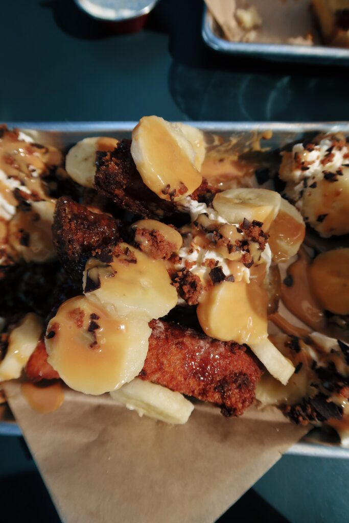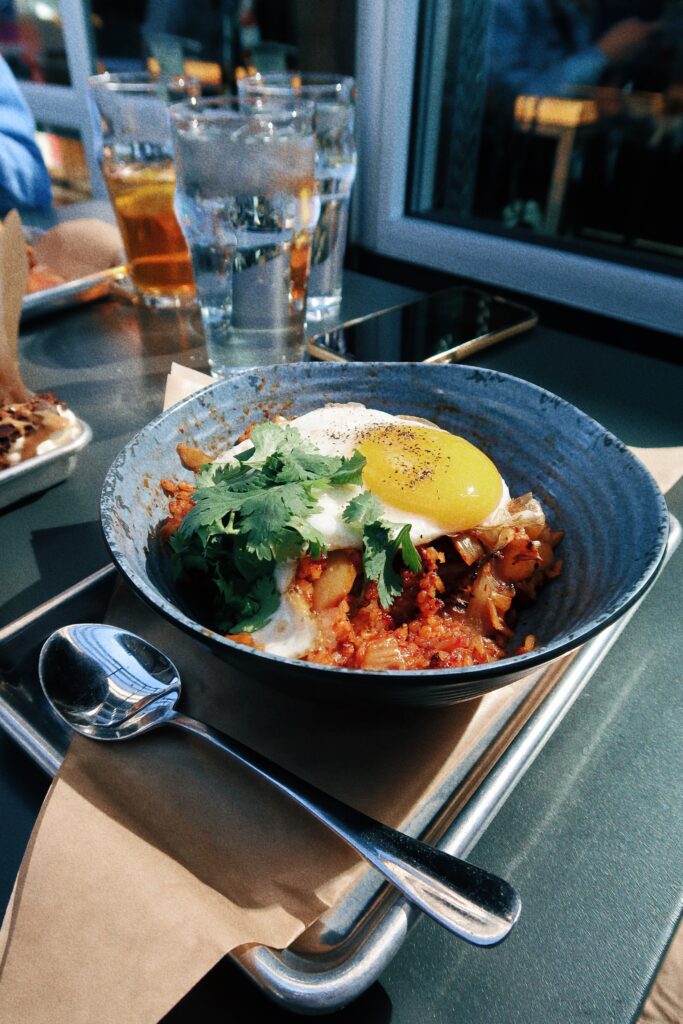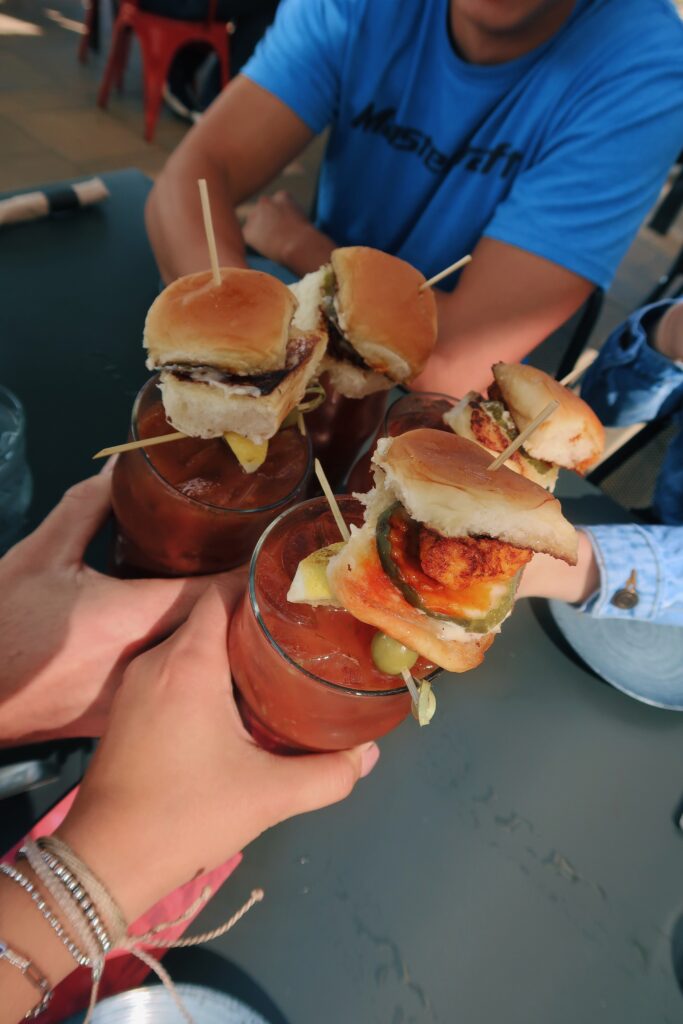 What we ordered: For drinks we kicked off the brunch with four orders spicy bloody mary’s — and they came with mini chicken sandwich sliders on the top — FREAKING DELICIOUS! For food, we started with steamed pork buns – so bomb. They were the FLUFFIEST Steam buns I’ve had in a while, and the pork was the perfect amount of sweet and spicy. For my meal, I opted for the kimchi fried rice (you NEED to try this). I am a die hard egg & rice gal for breakfast (if you didn’t know I’m half asian and it’s a staple I grew up on) and this dish was the perfect twist on my favorite dish. The kimchi was also the perfect amount of sweet with flavor, but also spicy. Kimchi is something that is easy to mess up, but I loved Next Doors! Michael (Fiancé) and our friends all ordered the Southern Fried Chicken Biscuit with spicy honey. It was the FLUFFIEST biscuit I’ve seen! Suggestion – if you like the mini sliders — drink your bloody mary’s fast and each order came with one on top… or beg your waitress to give you an extra to munch on (the boys were obsessed). They also brought out the french toast sticks — the sweetest, fried, french toast dish I’ve had. I think it was perfect to split between the four of us and to have to change it up from our more salty/savory dishes.