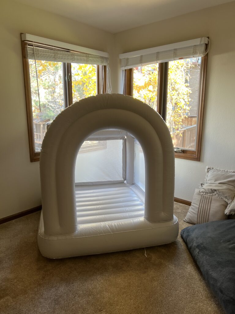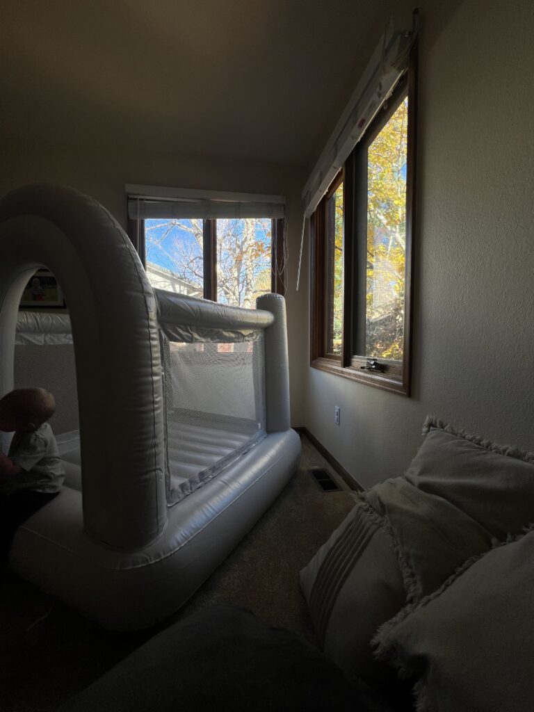 We currently have the Smol Mini Bounce House from Target set up at my mother-in-law’s house in her playroom — and honestly?
